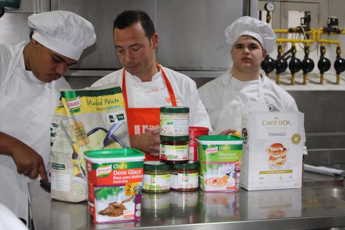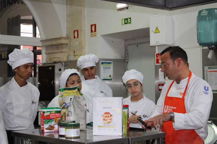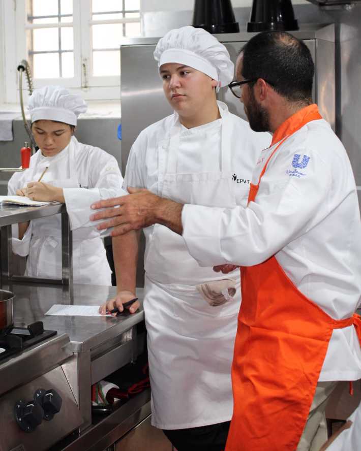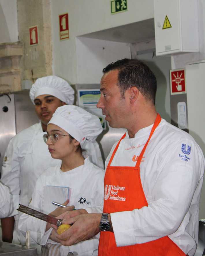 Na cozinha pedagógica da EPVT, os alunos do curso Técnico/a de Cozinha/Pastelaria participaram num workshop orientado pelos chefs Pedro Gaspar e Gonçalo Palma, representantes da Unilever Food Solutions Portugal – Produtos para Profissionais. Durante a sessão, os chefs apresentaram uma variedade de produtos das marcas Knorr e Carte D’Or, demonstrando as suas aplicações na confeção de diferentes pratos e sobremesas. Os estudantes tiveram oportunidade de observar técnicas profissionais e explorar novas soluções culinárias utilizadas na restauração moderna.