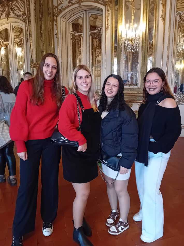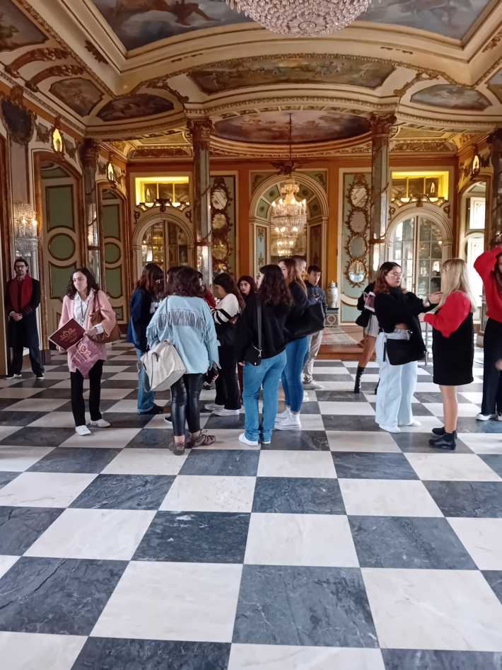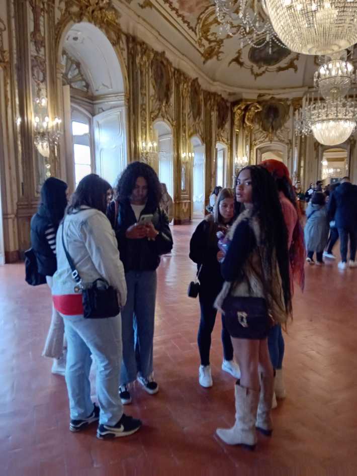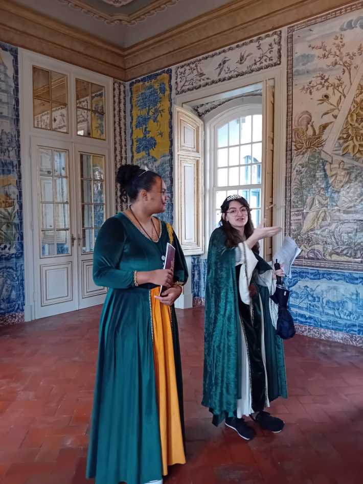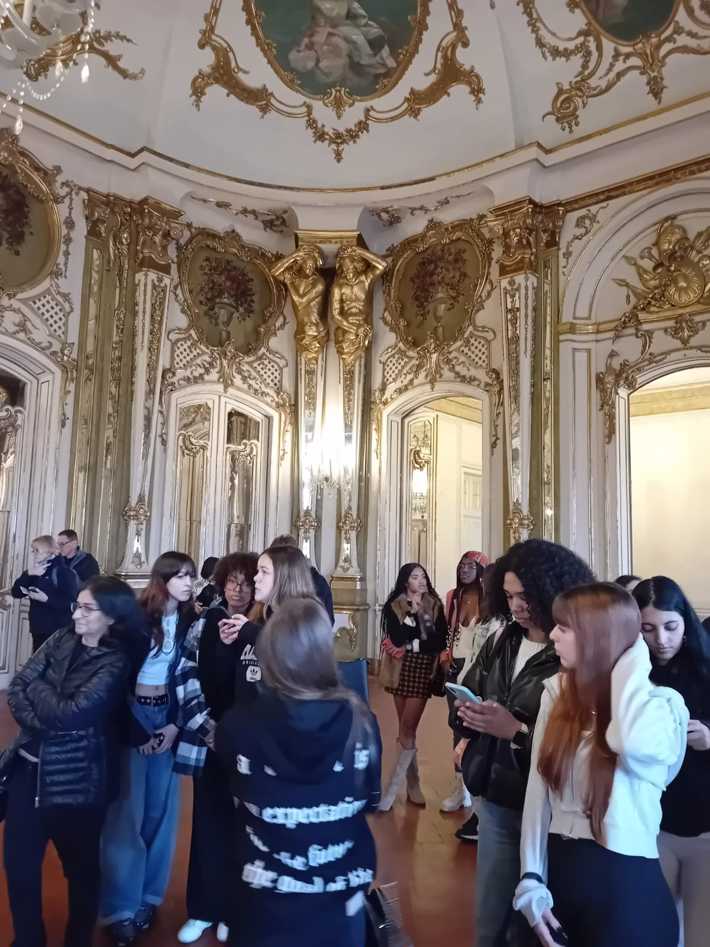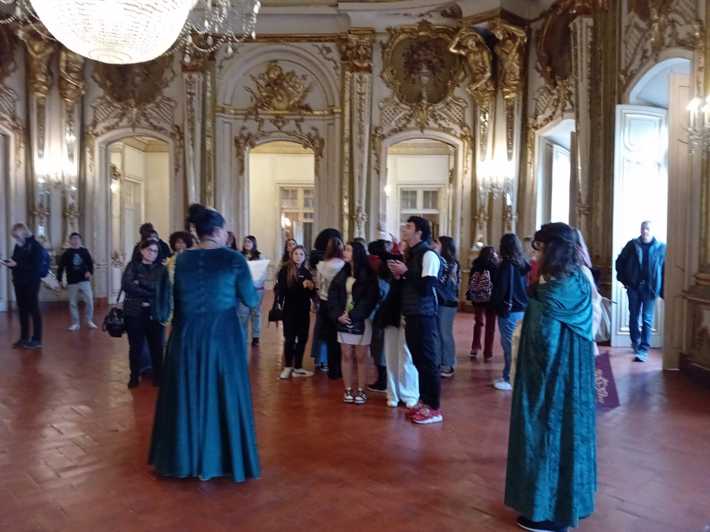 Durante a visita guiada ao Palácio de Queluz, os alunos envolvidos nos projetos de PAP promoveram uma visita encenada, que resultou numa experiência imersiva que os colocou no centro de toda a ação e história, como se estivessem numa peça de teatro.
