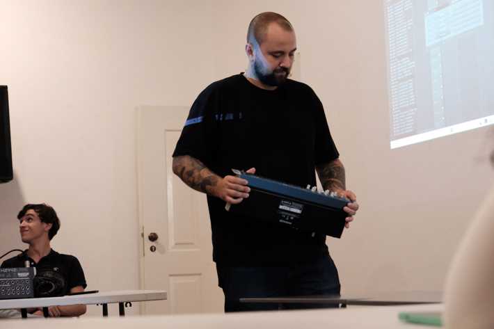 A sessão foi liderada pelo talentoso “Aranha” - músico, produtor, e docente de Multimédia na EPVT, conhecido pelo seu trabalho ligado ao universo do hip-hop. No estúdio, dedica-se sobretudo à composição e produção musical em ambiente digital - experiência que partilhou agora neste workshop.