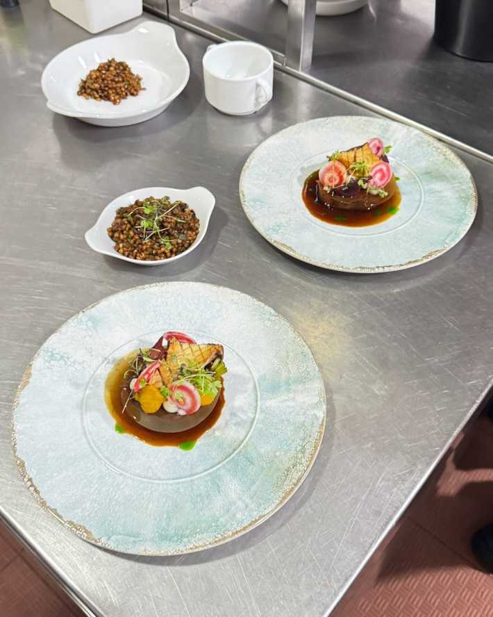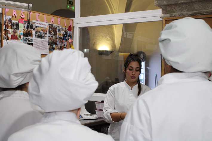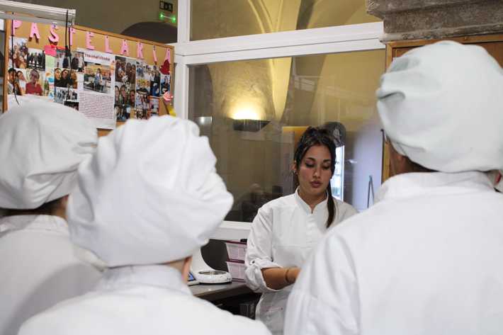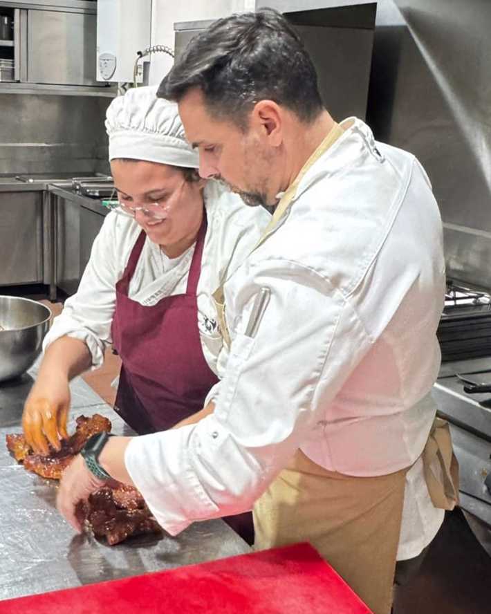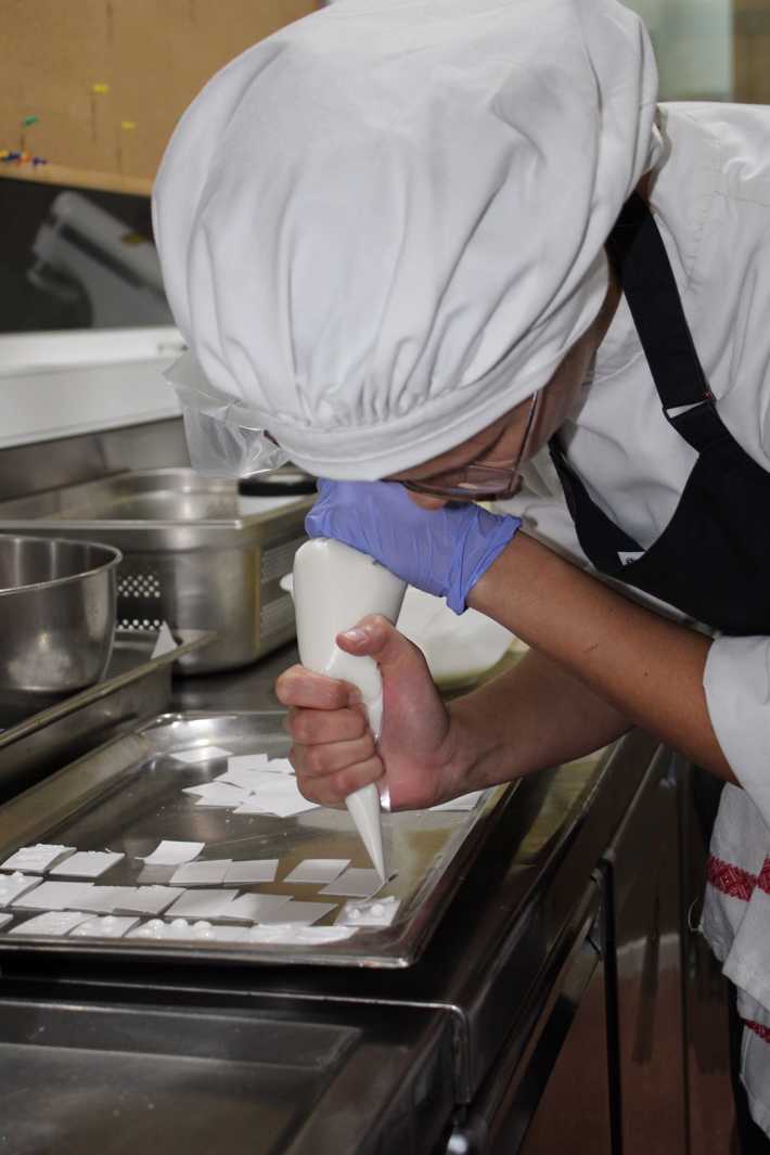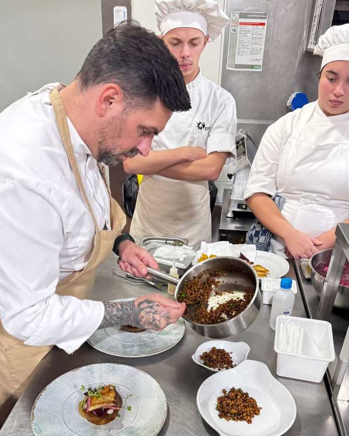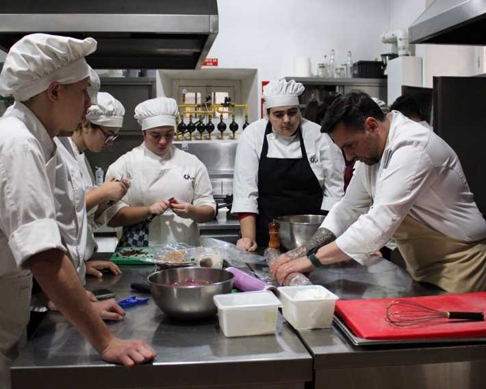 Após a conversa inicial, os chefs dinamizaram workshops práticos: Tiago Valente trabalhou técnicas culinárias e apresentação de pratos, enquanto Lara Figueiredo orientou a parte de pastelaria, explorando métodos de confeção, texturas e decoração. Os alunos puderam observar e experimentar novas técnicas e perceber a importância da precisão na Cozinha e Pastelaria.