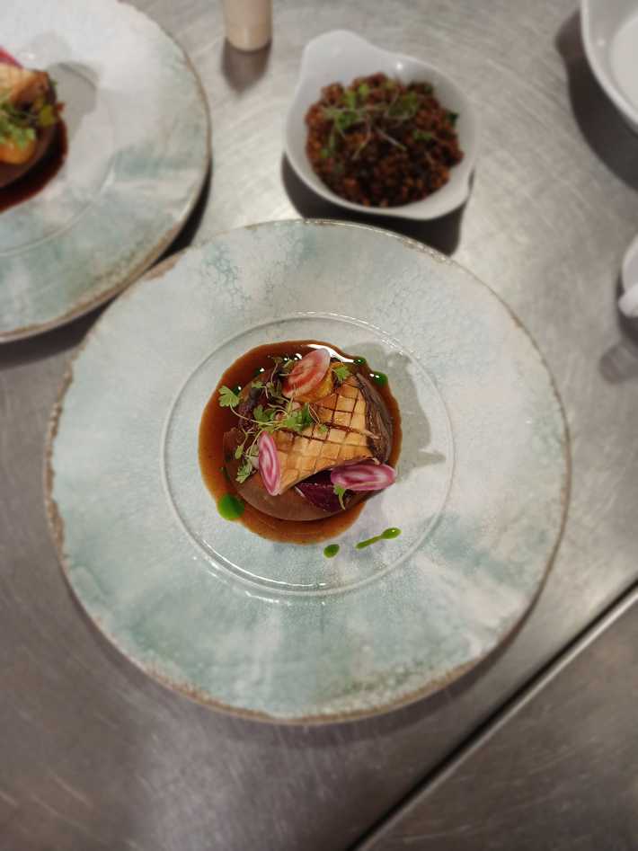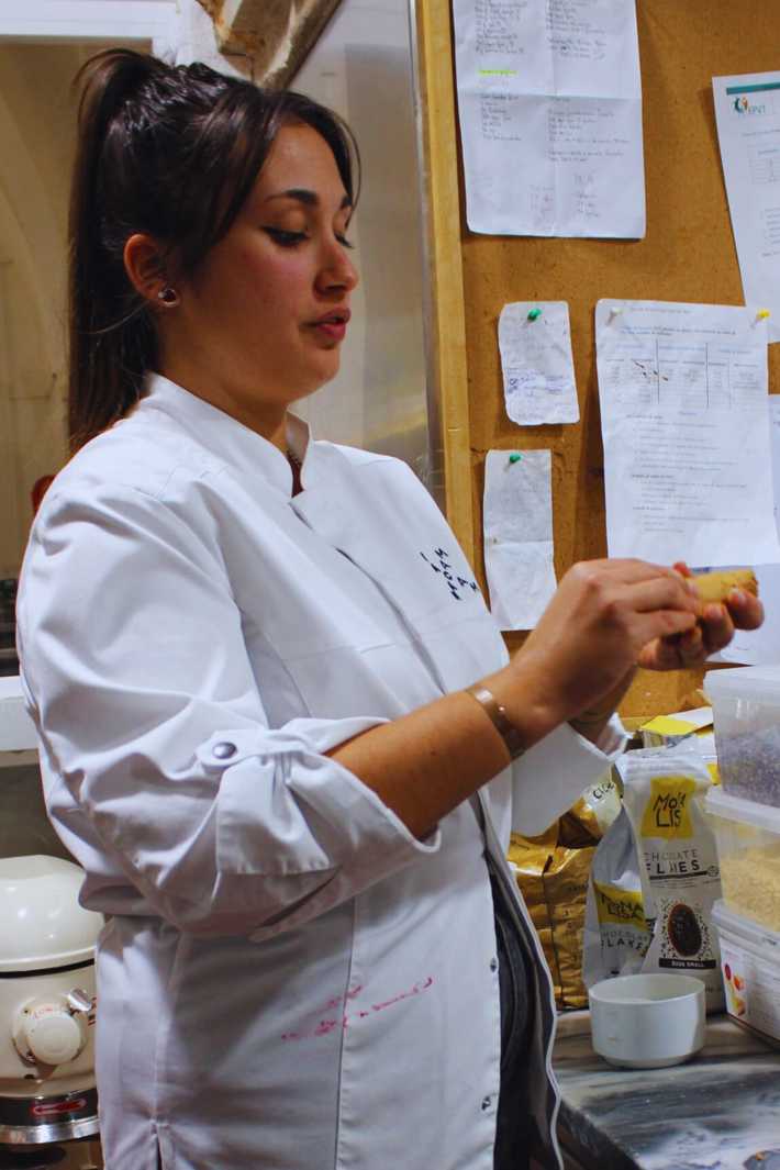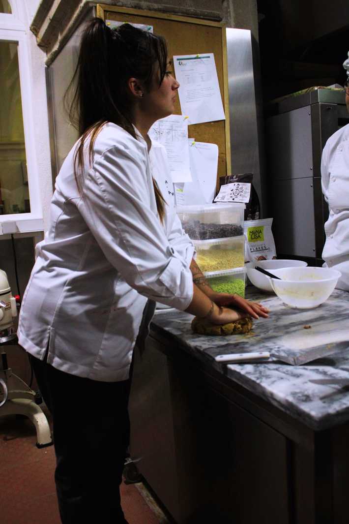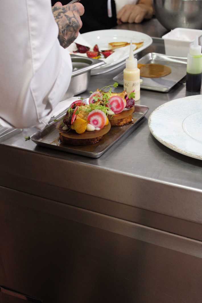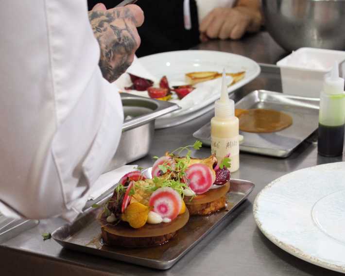Após a conversa inicial, os chefs dinamizaram workshops práticos: Tiago Valente trabalhou técnicas culinárias e apresentação de pratos, enquanto Lara Figueiredo orientou a parte de pastelaria, explorando métodos de confeção, texturas e decoração. Os alunos puderam observar e experimentar novas técnicas e perceber a importância da precisão na Cozinha e Pastelaria.