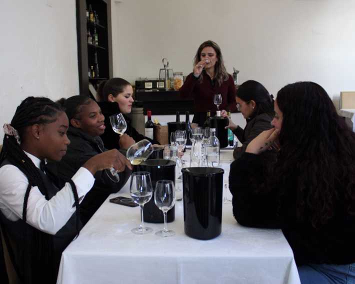 De seguida, realizou-se uma prova orientada de vinhos, na qual os alunos puderam identificar aromas, perceber notas frutadas, florais ou minerais, analisar corpo, acidez e final de boca, além de aprender técnicas profissionais de prova, como a observação da cor, a oxigenação e a avaliação olfativa.